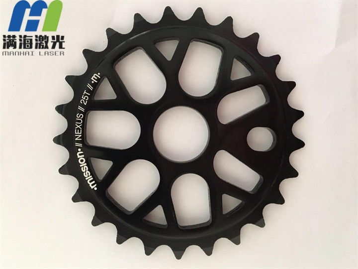 3.首先將產品放在鐳射區的治具上(shàng),正麵鐳射,此產品需要分(fèn)二次定位鐳射,牙盤和曲柄需分開定位,產品鐳射(shè)圖(tú)案,正雕正看,需把表麵(miàn)黑色陽(yáng)極層雕掉,呈反白效果,要求激光鐳射後的圖案無鋸(jù)齒(chǐ)和發黑及未雕幹淨的現象,表麵不可有劃傷和手指印情況(kuàng),首件激光刻字後交由品管確認鐳射圖案的方向(xiàng),大小,鐳射(shè)後的效(xiào)果, OK後再(zài)進行生產。