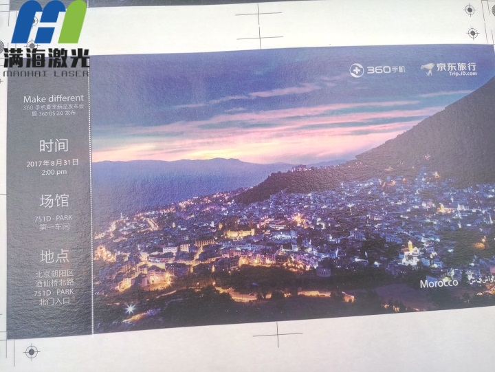 工藝(yì)要(yào)求:對產品(pǐn)的位置大小進行虛線切穿鏤空,要求彩色紙卡表麵無發黃(huáng)發黑效果,紙卡印有(yǒu)黑色實線處,需對準實線的位置垂直激光切穿虛線效果。