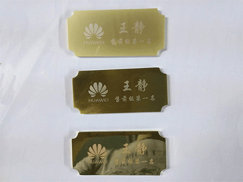 3. 來料由檢驗員全檢是(shì)否表麵電鍍層刮花,技術員(yuán)調試好雕刻(kè)第一(yī)片產品由品管確(què)認首件,首件確認激光(guāng)雕刻華為獎(jiǎng)牌的尺寸、位置(zhì)、效果,產品上、左、右邊(biān)居中(zhōng),刮表(biǎo)電鍍層,字體清晰,不可有發黃(huáng)及鋸齒現象(xiàng)。